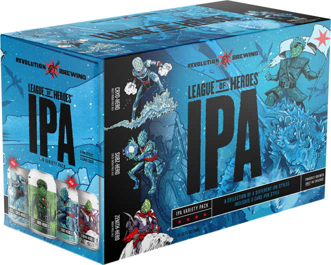 Each member of the League of Heroes is canned within days of each other, with the born-on-date of the oldest can stamped on the box. The team at Revolution Brewing packages the Leagues of Heroes multiple times per month to ensure maximum freshness.
