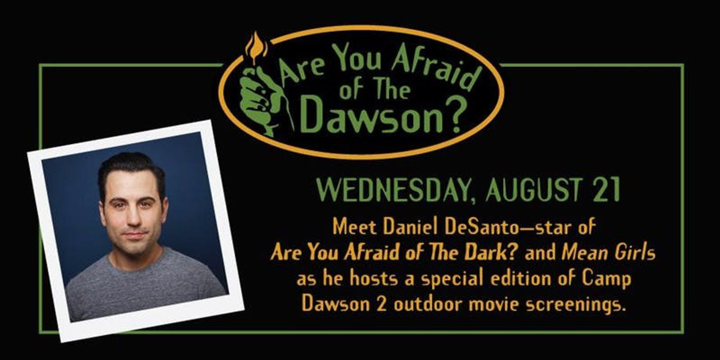 “Submitted for approval of the Midnight Society, I call this story… The Tale of Camp Dawson 2.” Relive the glory days of SNICK with a special edition of The Dawson’s Outdoor Movie Night. Daniel DeSanto, best known as Tucker from Are You Afraid of The Dark? and Jason from Mean Girls, will be on hand to host screenings of the hit TV show and movie.