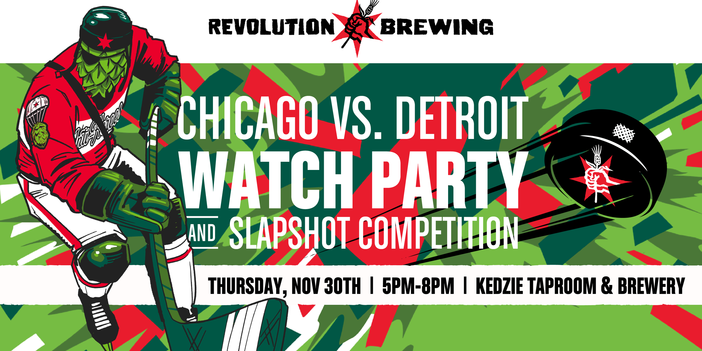 Join us at Revolution Brewing for the Chicago vs Detroit watch party and slap shot competition! There will be Anti-Hero draft specials, giveaways, snacks, and multi-screen viewing with sound.