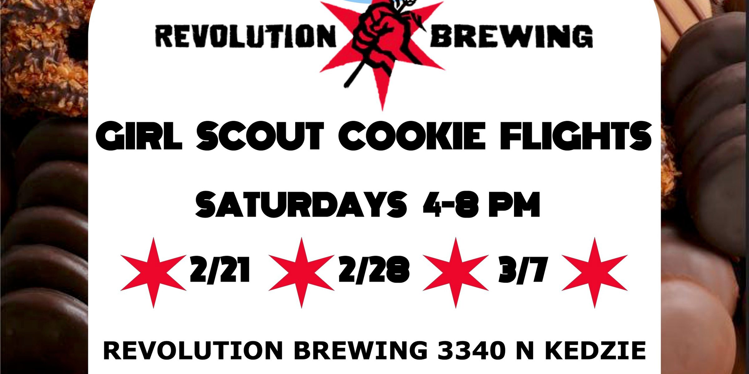 It’s cookie time! Join us for Girl Scout Cookie flights to pair with a box you can pick up from Girl Scout Troop 20334, who will be selling on-site.