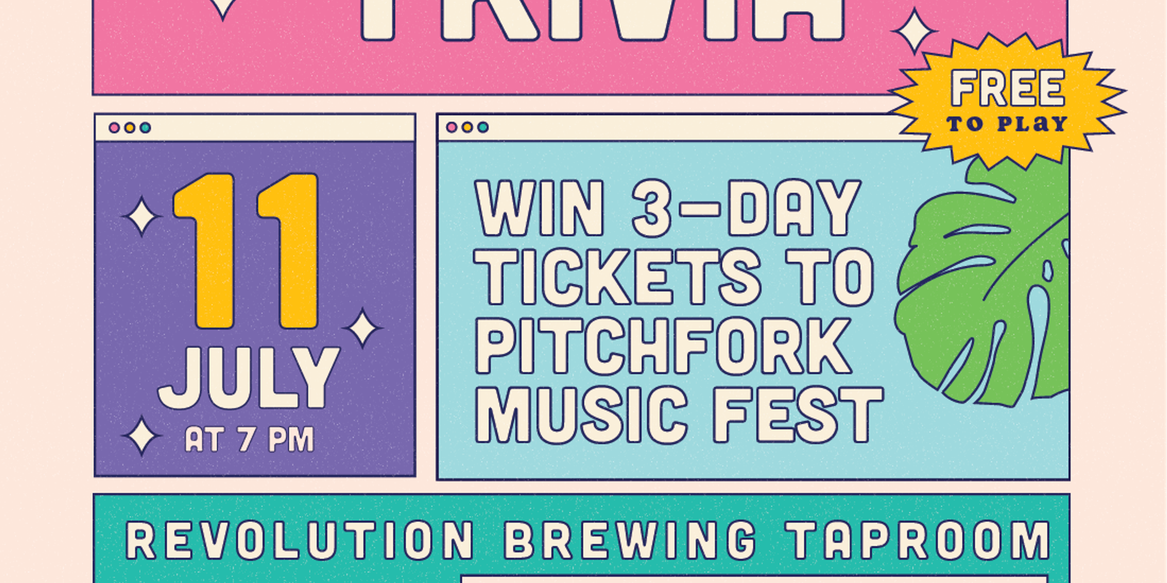 Win a pair of 3‑day GA passes to Pitchfork this Thursday evening at Revolution Brewing’s Production Brewery & Taproom 🎟️🍻📅 Gather your squad and test your knowledge in a 90’s Music trivia battle hosted by @thequizzdaddy. Enjoy the Official Beer of Pitchfork while you play🍺Winners will score passes to Pitchfork Music Festival at Union Park, happening July 19–21st. Don’t miss out! 🙌