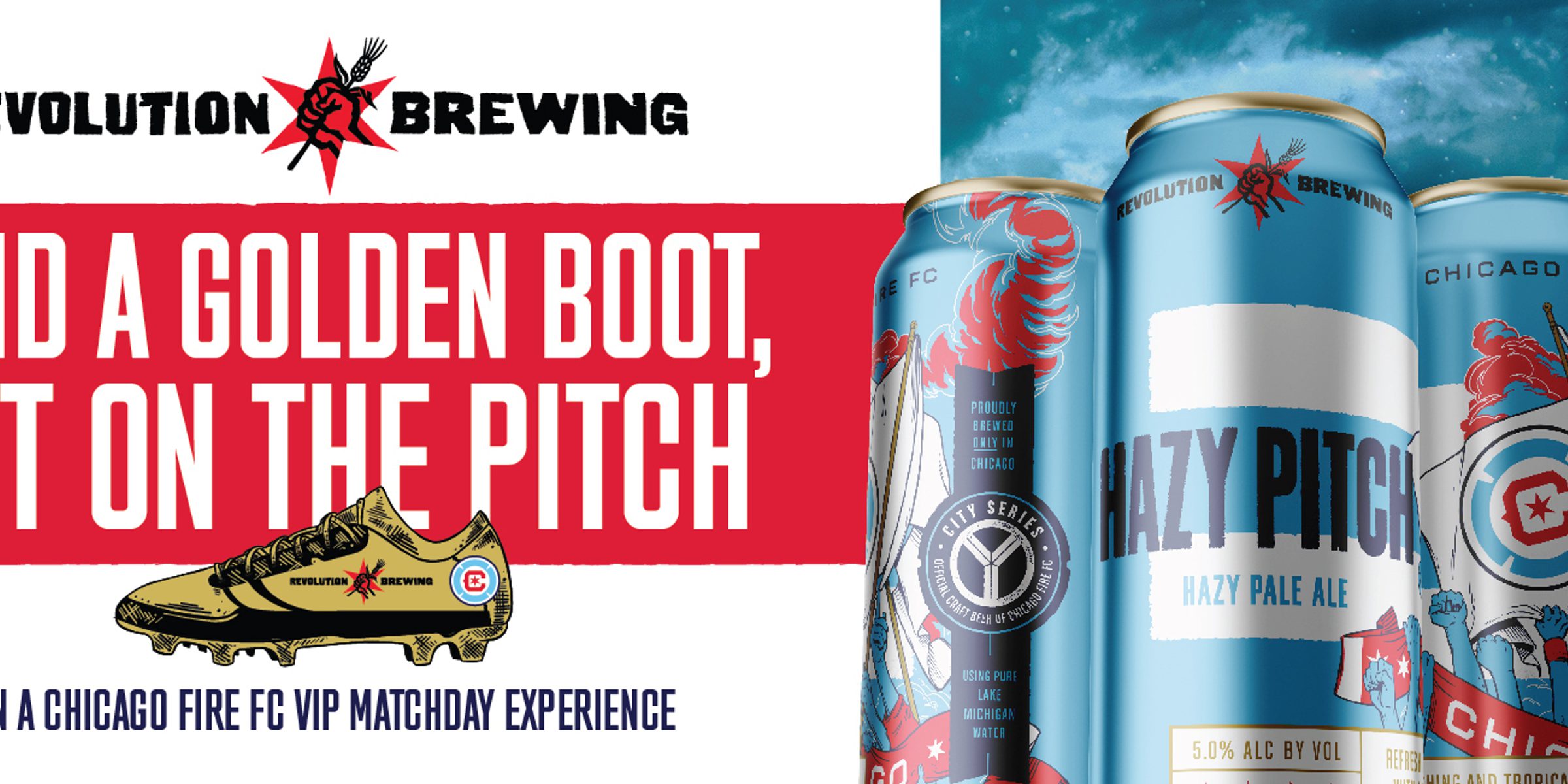 To celebrate the second season of our partnership as the Official Craft Brewery of Chicago Fire FC, Revolution Brewing is offering fans a chance to get on the pitch before a home match (date TBD) and watch in style with the Revolution crew. Purchase a four-pack of Hazy Pitch for your chance to find a Golden Boot in one of 23 random four-packs.