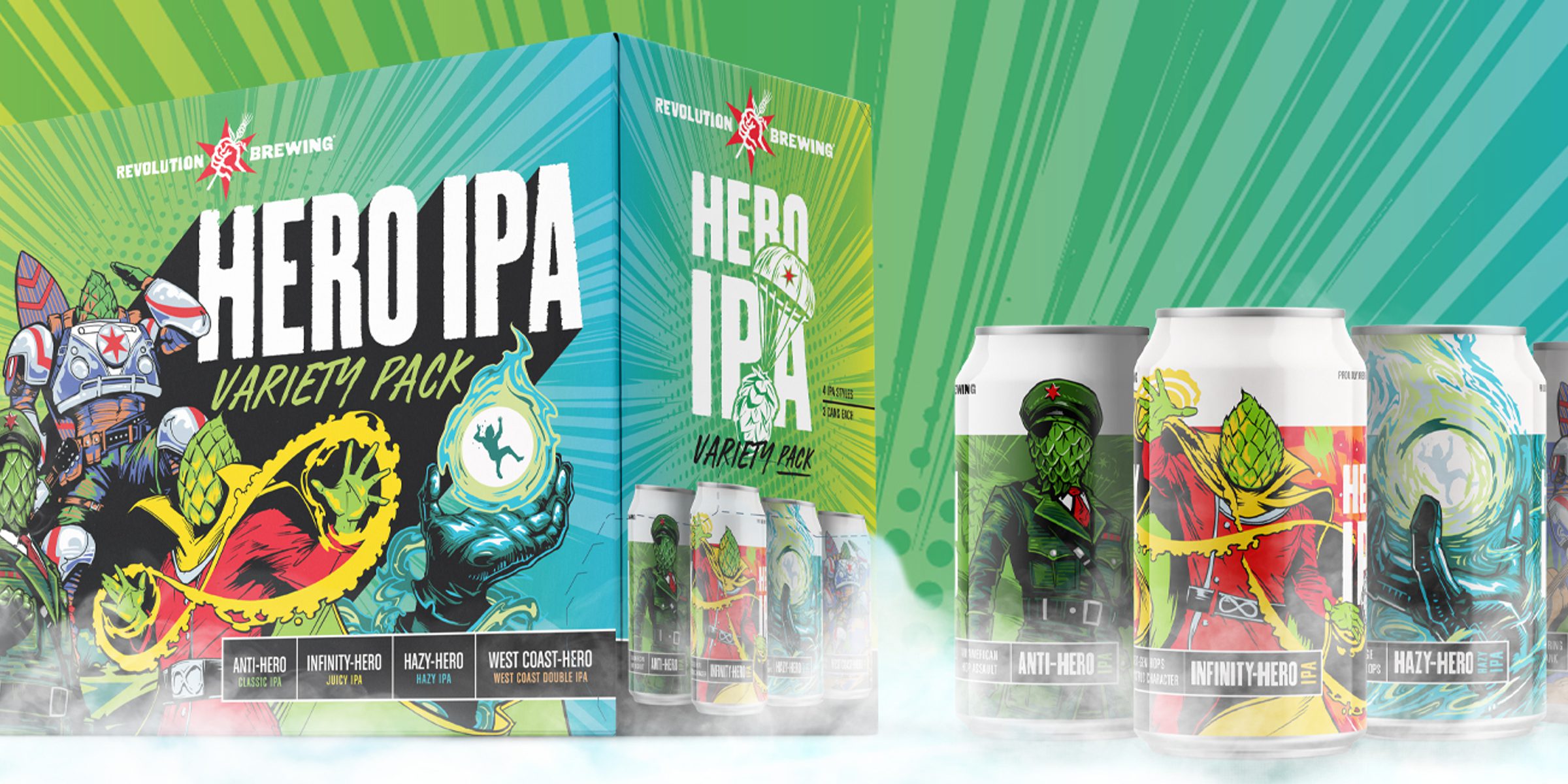 The League of Heroes is transitioning out, but its influence on the Hero IPAs that Revolution creates lives on in not just the new Variety Pack, but the small batch and DDH Heroes that carry the torch for hop exploration and innovative new flavors. And as a final flourish of welcoming a new Hero to each 12-pack, we’ve created a permanent home for West Coast-Hero, our most popular Small Batch beer and the most-revisited brew in that program. Long live the Heroes.