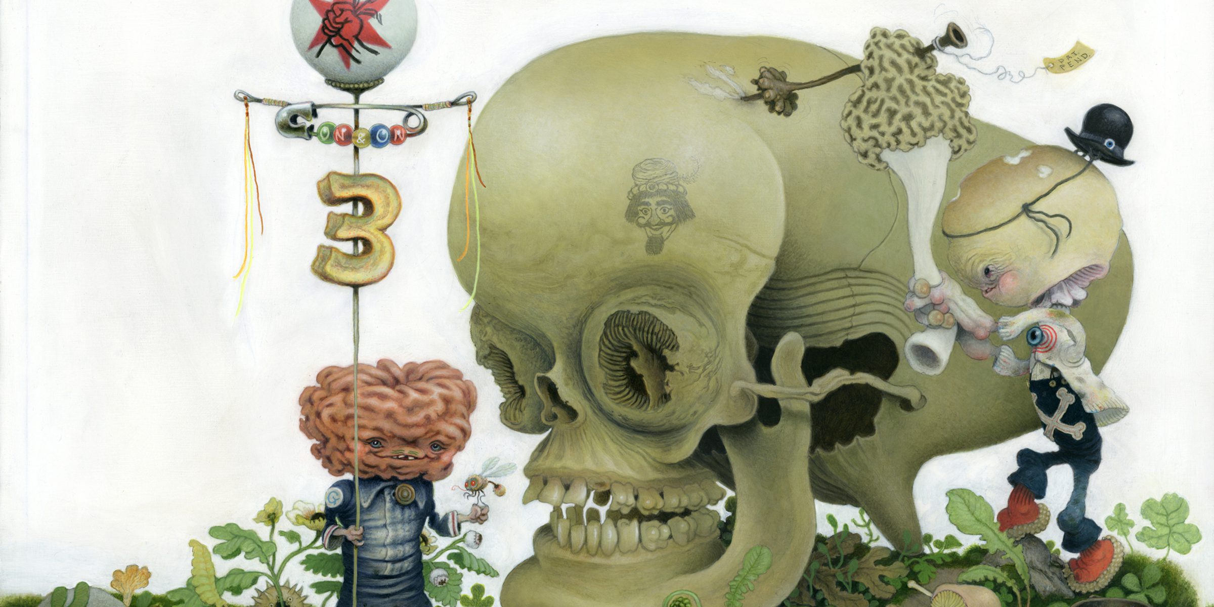"They're scavengers, picking up what they find to work as scrimshaw apprentices," Gordon said, pointing out his own filter on the use of skulls in art (including the Deep Wood Series' well-established look). "The false morel mushroom, who kind of looks like a brain and kind of looks like Gomez Addams, is a recurring character in my pantings."